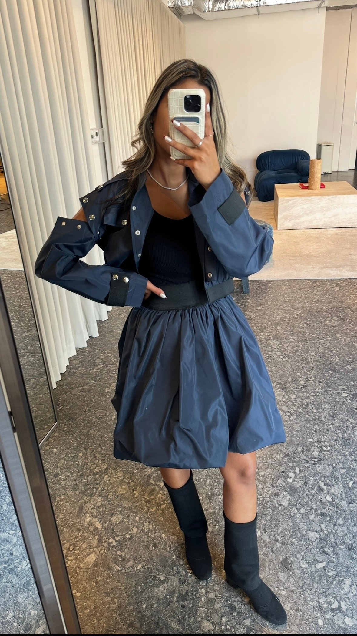 - Model is wearing size XS, skirt length 22″
