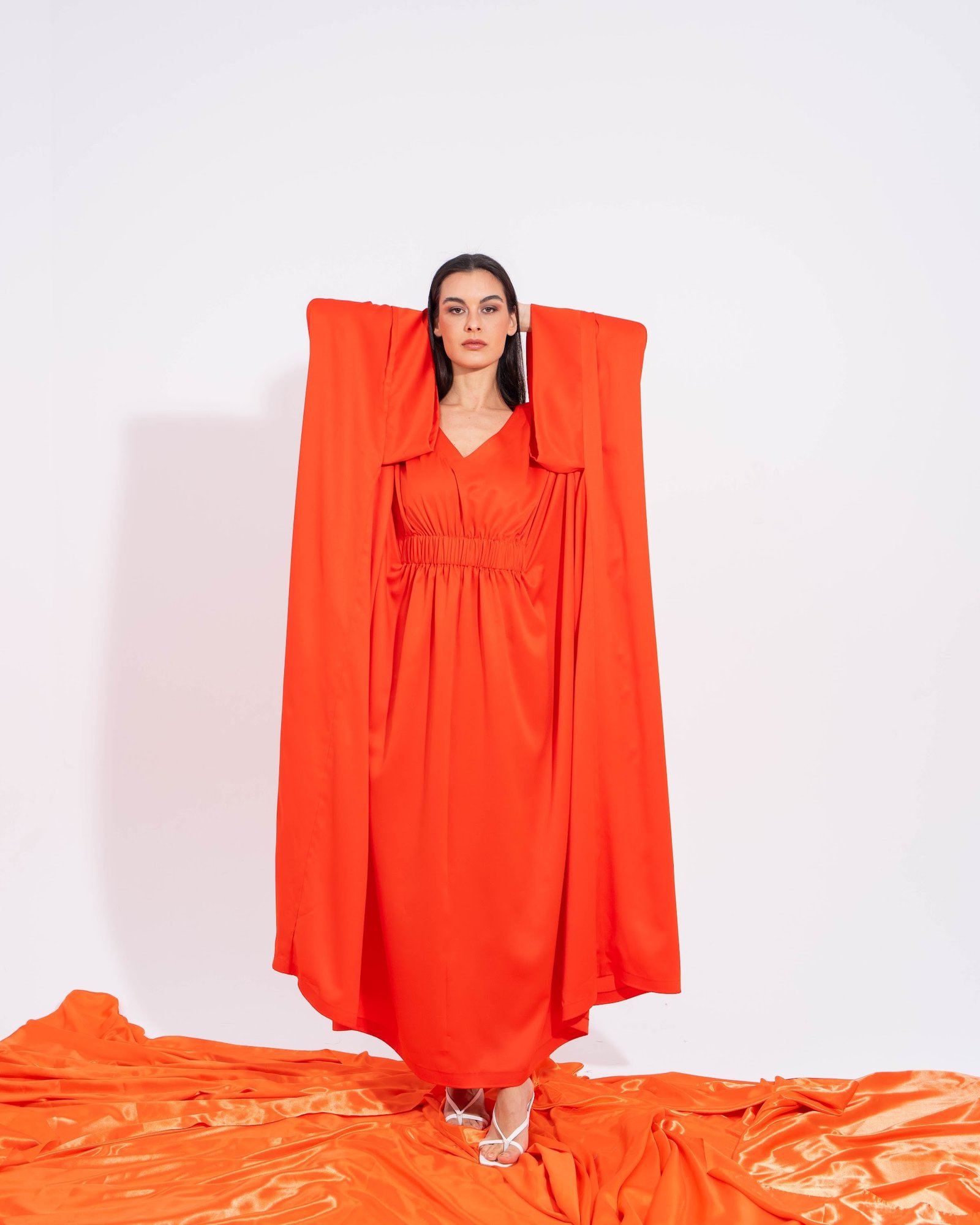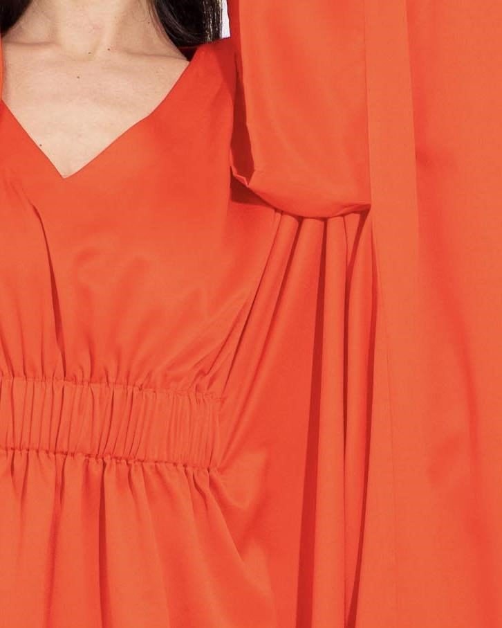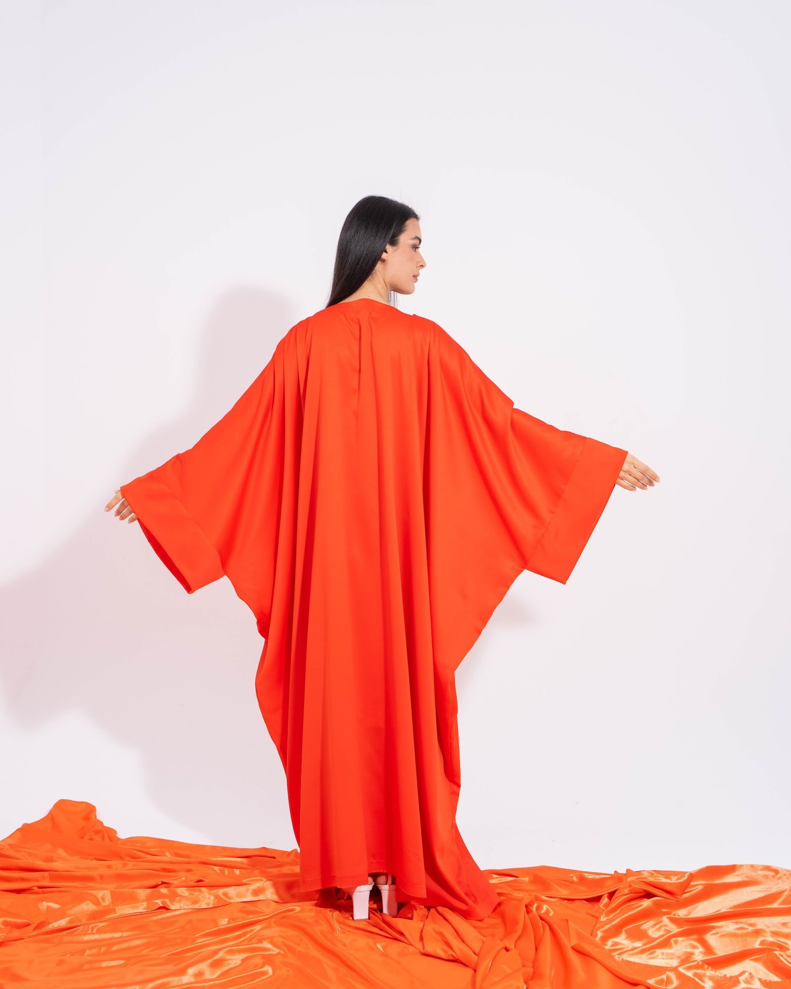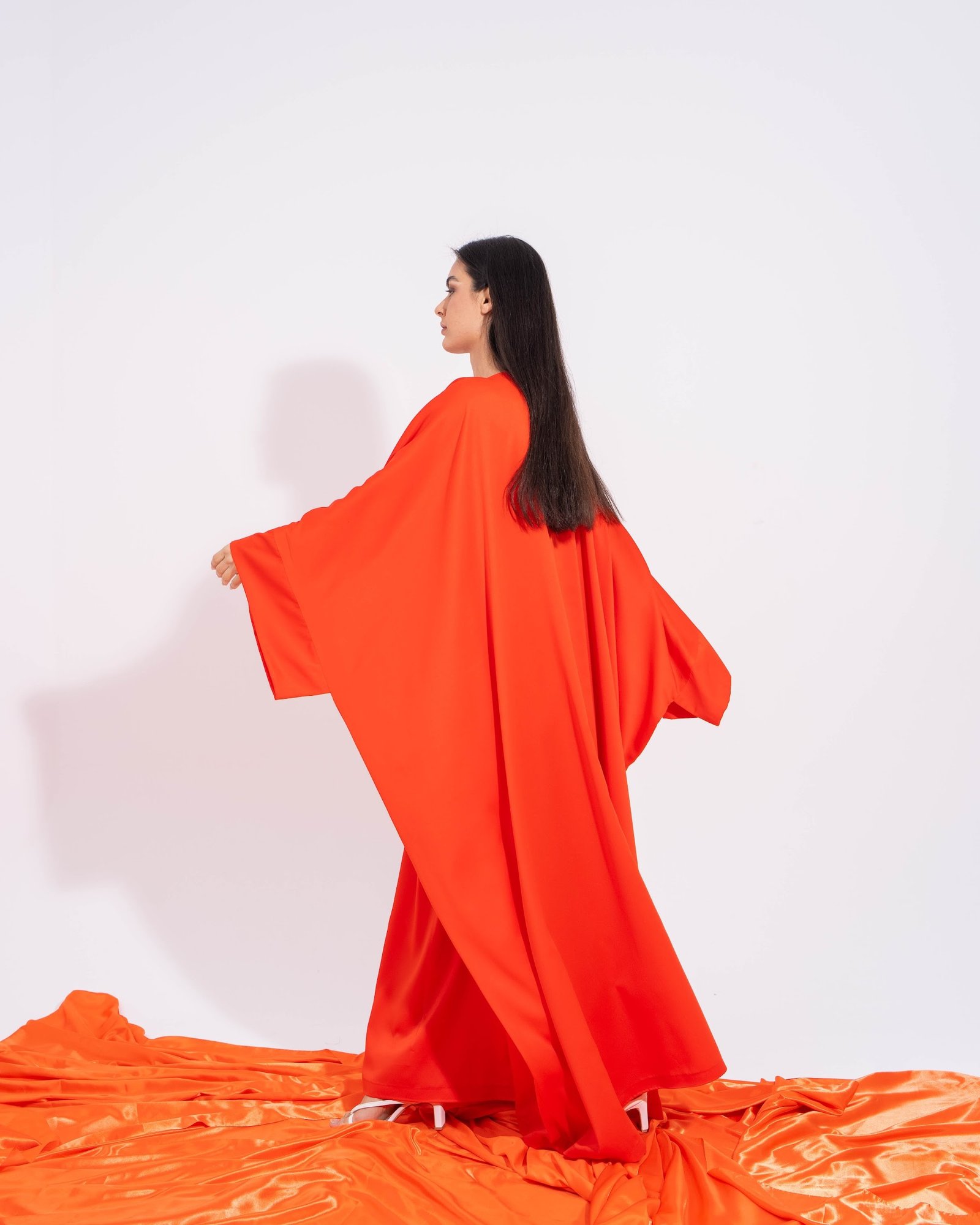 Wide cut kaftan with cinched rubber band waist with inner belt to fasten on the waist