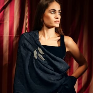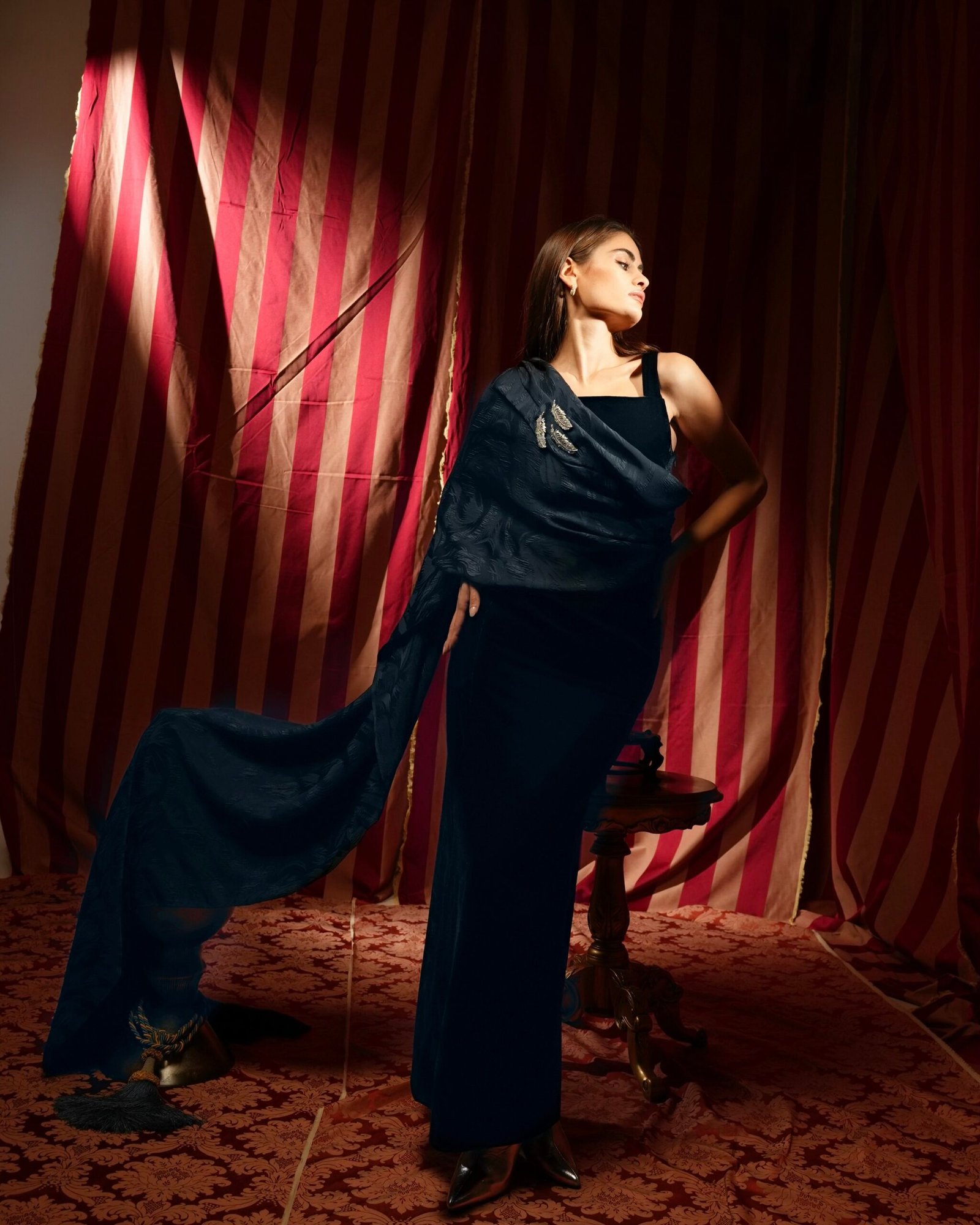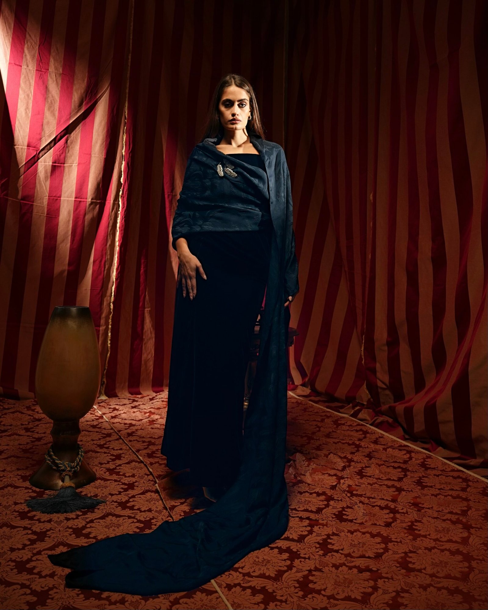 - Fabric & color: velvet in navy blue, with satin scarf in navy blue.