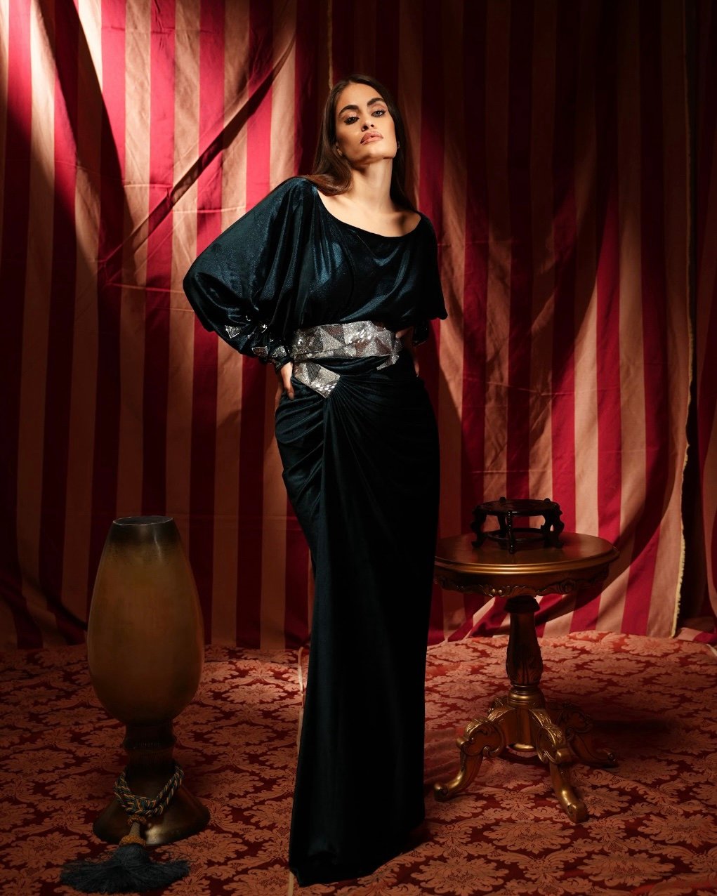 - Fabric & color: velvet blue/ green.