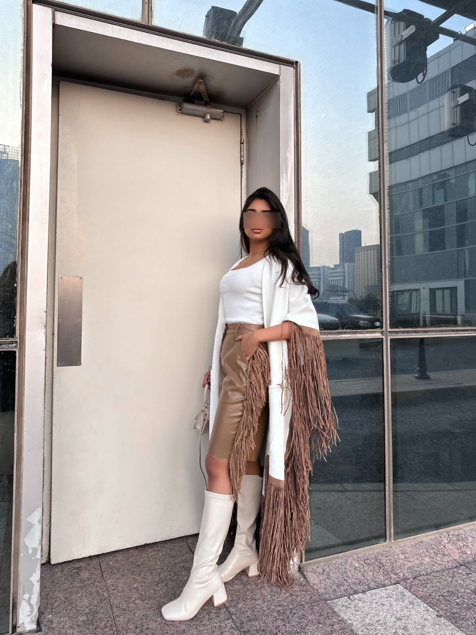 - Color: Off-white tricot, brown synthetic leather, brown fringe.