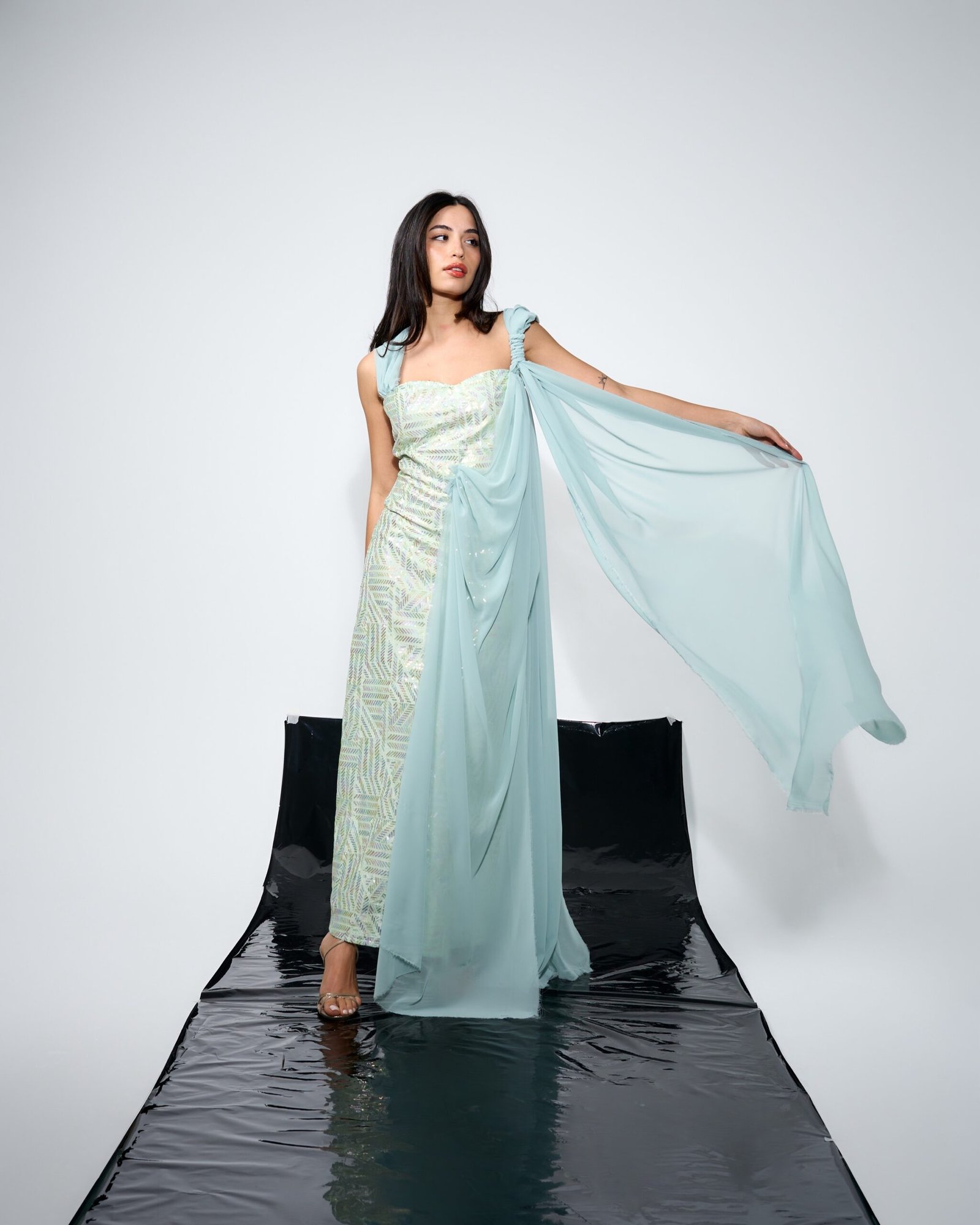 - Fitted sequins detailed dress with chiffon.