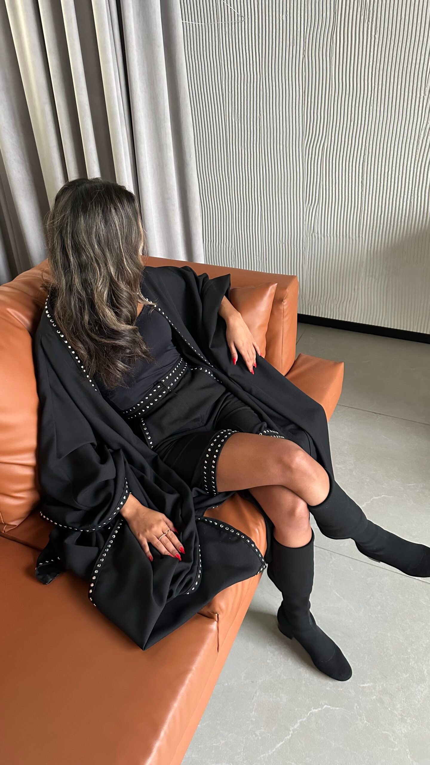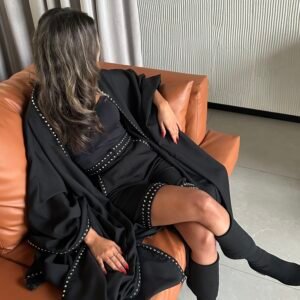 - Bisht: Poncho with side slit with and studded trim.